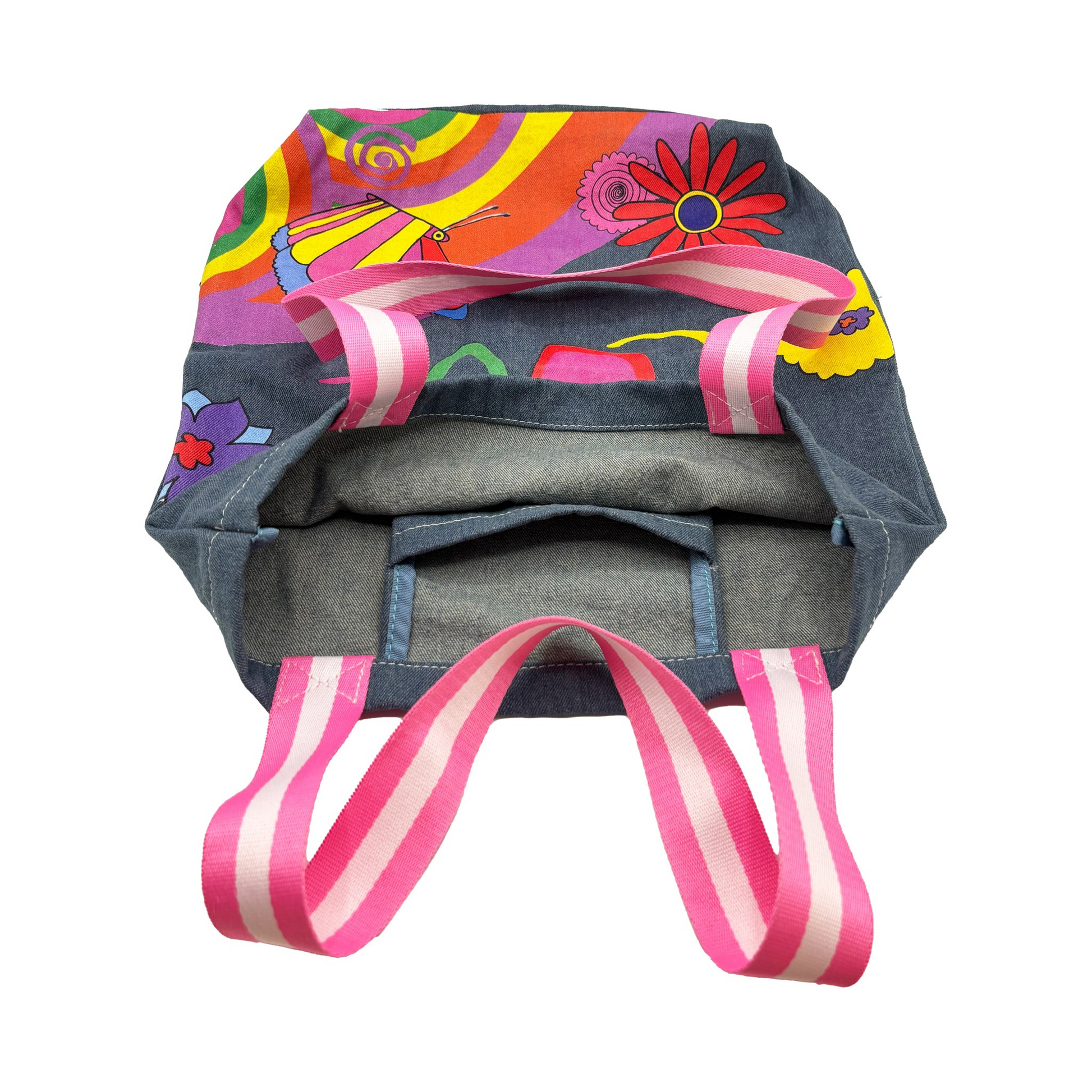 Esta tote bag de denim inspirada en “All You Need Is Love” de los Beatles captura toda la esencia psicodélica de los años 60 con colores vibrantes, flores, arcoíris y mariposas. Un bolso lleno de energía positiva que convierte cualquier look en una declaración de estilo y música.